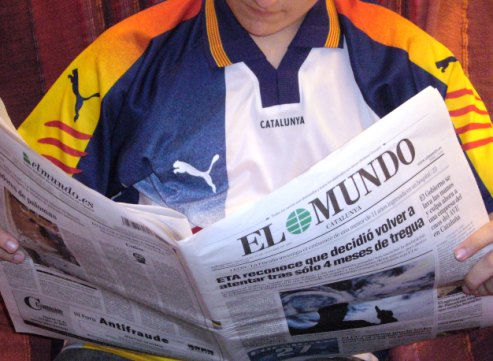 L’origen de la imatge és l’assignatura de seminari. La qüestió és que s’havia de fer una fotografia d’un contrast, i en el meu cas vaig haver de fer un contrast polític. A la imatge es veu una persona amb la samarreta de la selecció catalana llegint una cosa rància com El Mundo, amb tota tranquilitat. Crec que el contrast és prou evident. I tot i que em va semblar que a classe l’exposició del tema deixava una mica indiferent a la gent, se m’en refot. Es veu que l’important era portar la foto, més enllà de si estava més bé o no. Doncs a la gent més pròxima meva sí que els ha fet gràcia, alhora que sorpresa, aquesta imatge. Amb algú, fins i tot, m’he hagut de justificar més del compte perquè no pensés el que no és. I això em satisfà bastant més. Total, a la facultat no deixes de ser un número que has de complir unes ordres per intentar que t’aprovin escrivin un examen amb allò que pugui satisfer més al professor/a de torn. Per això la vida real, pràctica, és prioritària. I molt millor!